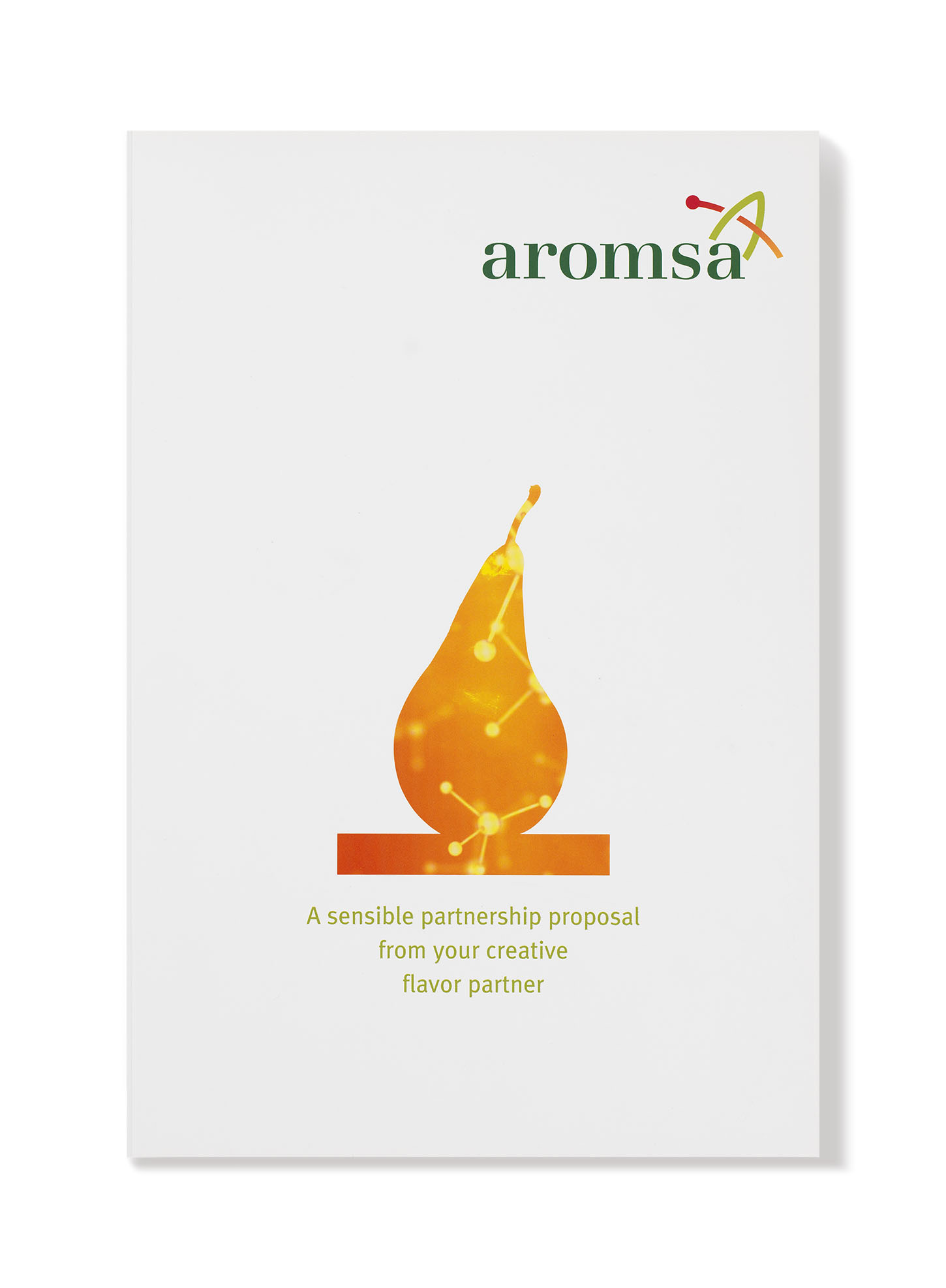 “We get inspiration from nature and combine it with science.” Cover of a brochure for Aromsa, a company creating flavours for food.